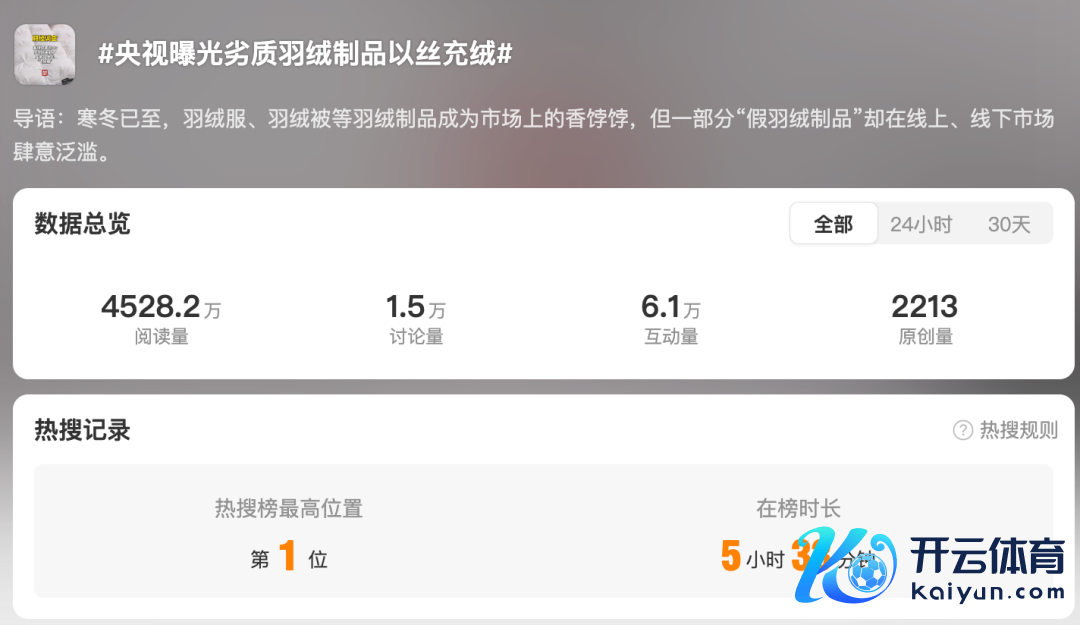 音问传出后,马上激发烧议。“央视曝光劣质羽绒成品以丝充绒”话题也一度登上微博热搜榜单第一位,在榜时分长达5小时33分钟。适度发稿,该话题阅读量超4500万次。