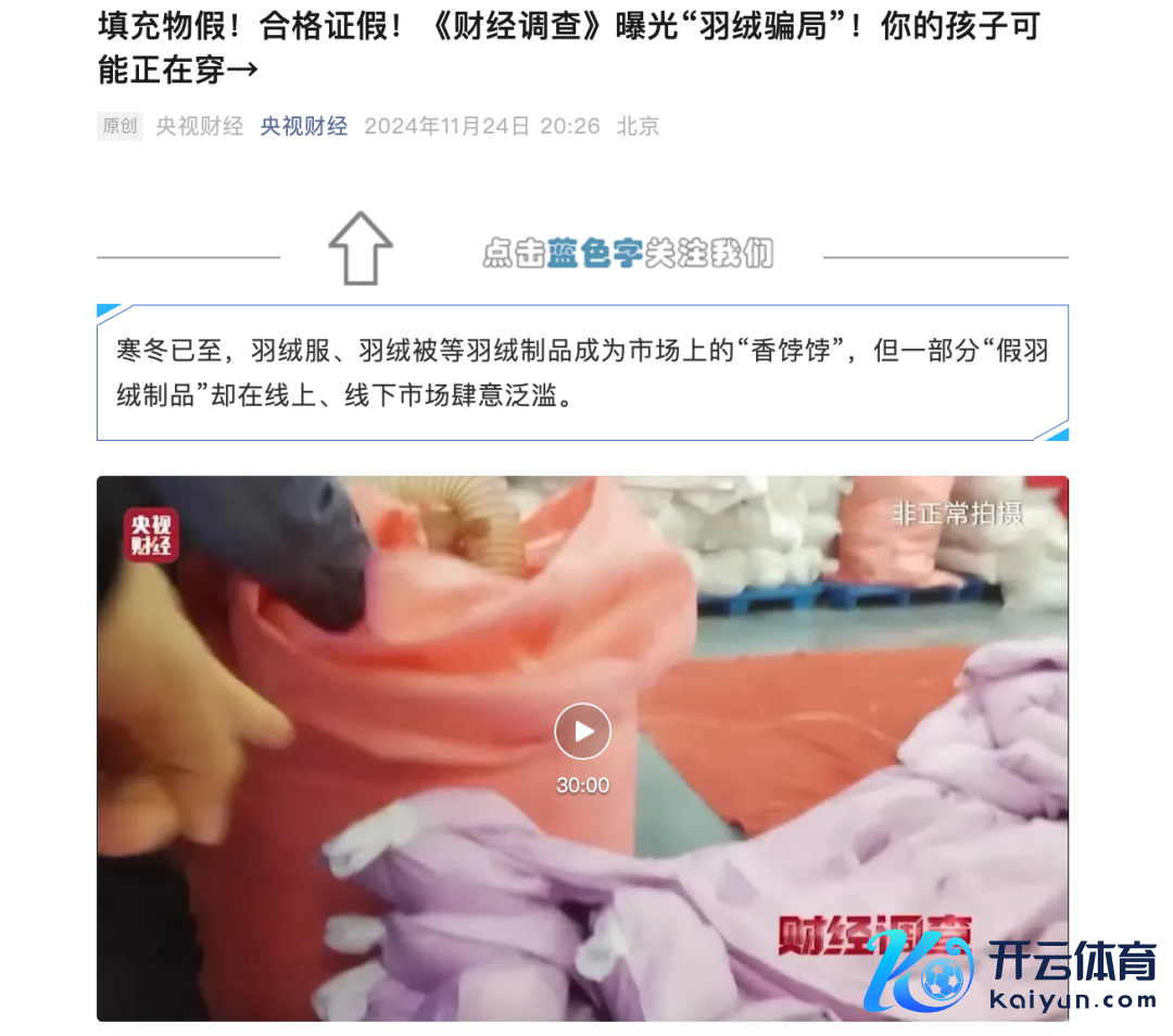11月24日,央视财经《财经走访》栏目报说念称,记者通过暗访江苏南通市一些电商公司发现,部分羽绒被填充物存在以“丝”代“绒”的问题,联系居品的质检敷陈、羽绒充气标等齐是假的,且成品从外不雅上难以分离真假。此外,其他方位的部分服装企业,也存在使用冒充的羽绒辅料出产分歧格羽绒服的问题。