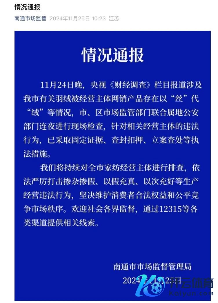 在被央视曝光劣质羽绒成品以“丝”充“绒”问题后,11月25日上昼,南通市商场监督解决局发布情况通报称,针春联系缱绻主体的罪犯手脚,已禁受固定左证、查封扣押、立案查处等法则步骤。