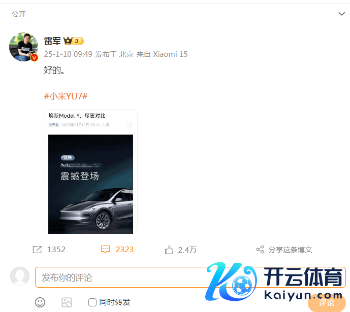 对于特斯拉Model Y的上线,小米创举东谈主、董事长兼CEO雷军带“小米YU7”话题转发特斯拉推文《焕新Model Y,尽管对比》并驳倒:“好的。”